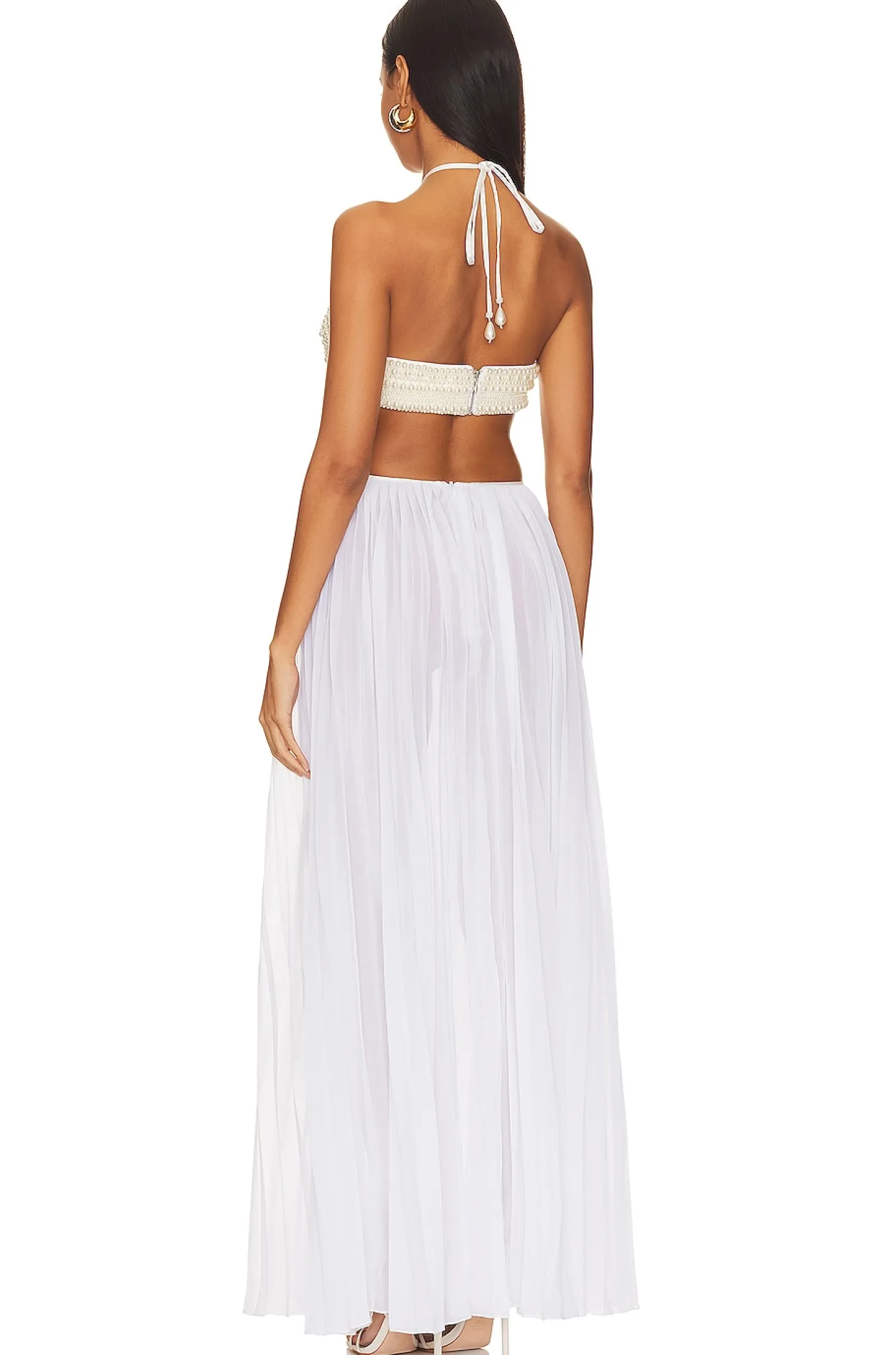 Self 1: 100% nylon Self 2: 100% polyester Lining: 95% polyester 5% lycra.Made in India.Dry clean only.Detachable pearl embellished top with halterneck tie closure and exposed back zipper closure.Hidden back zipper closure.Cut-out styling Pliss fabric.Garment is intentionally sheer, undergarments will show through. Please note undergarment not included