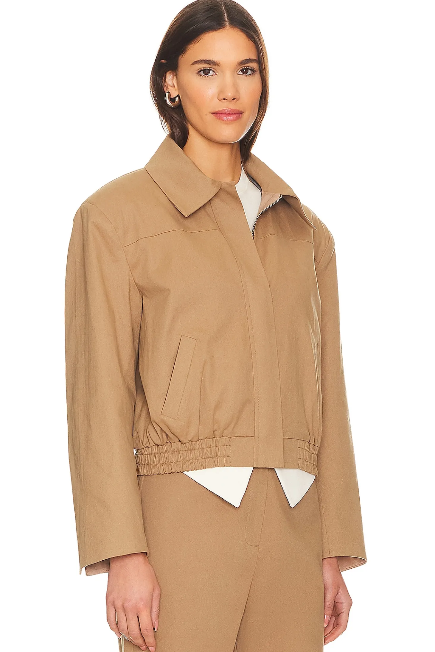 97% cotton 3% elastane.Made in Turkey.Machine wash.Front zipper closure.Padded shoulders.Side slant pockets.Canvas fabric with smocked elastic hem.Item not sold as set