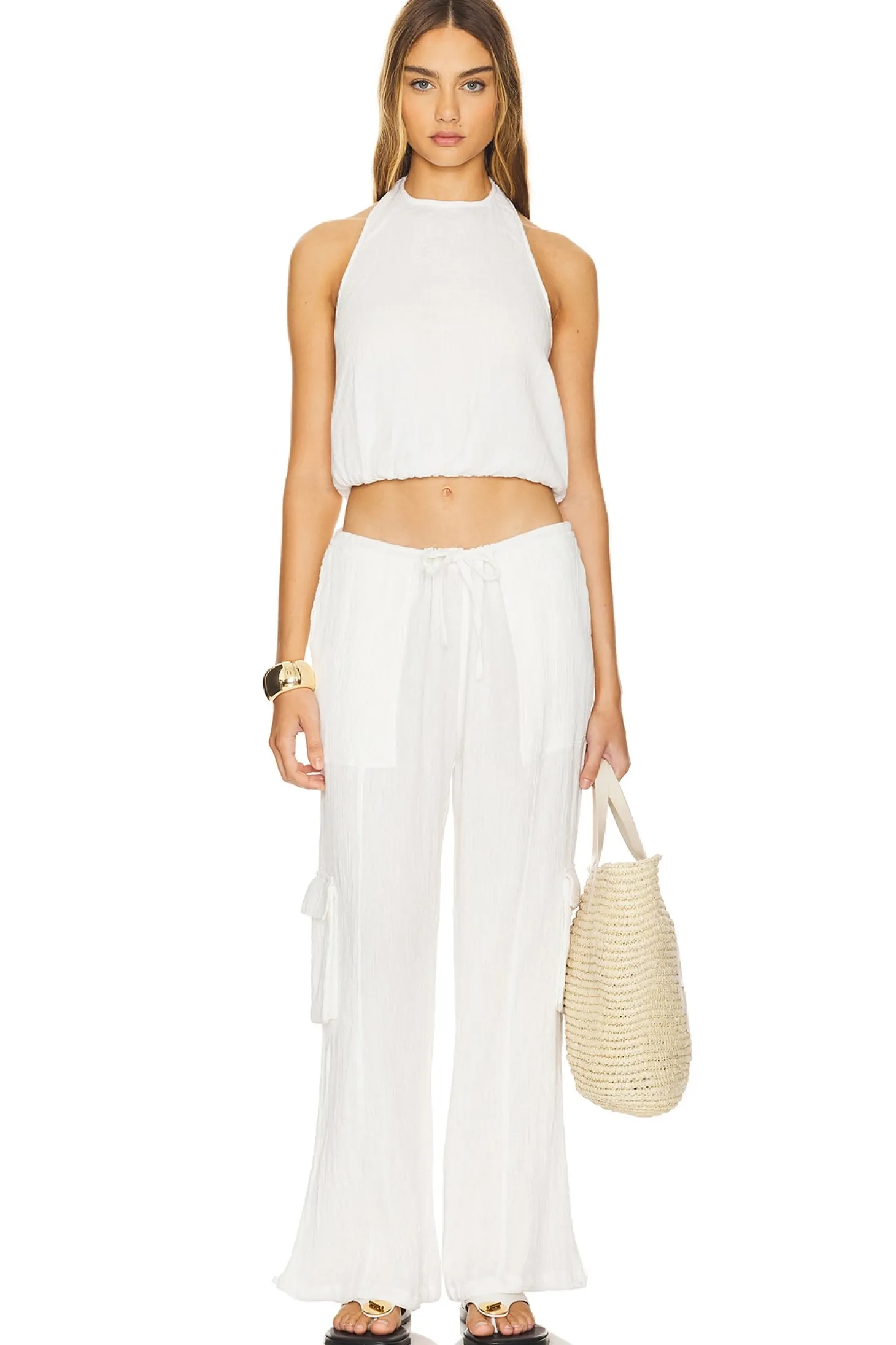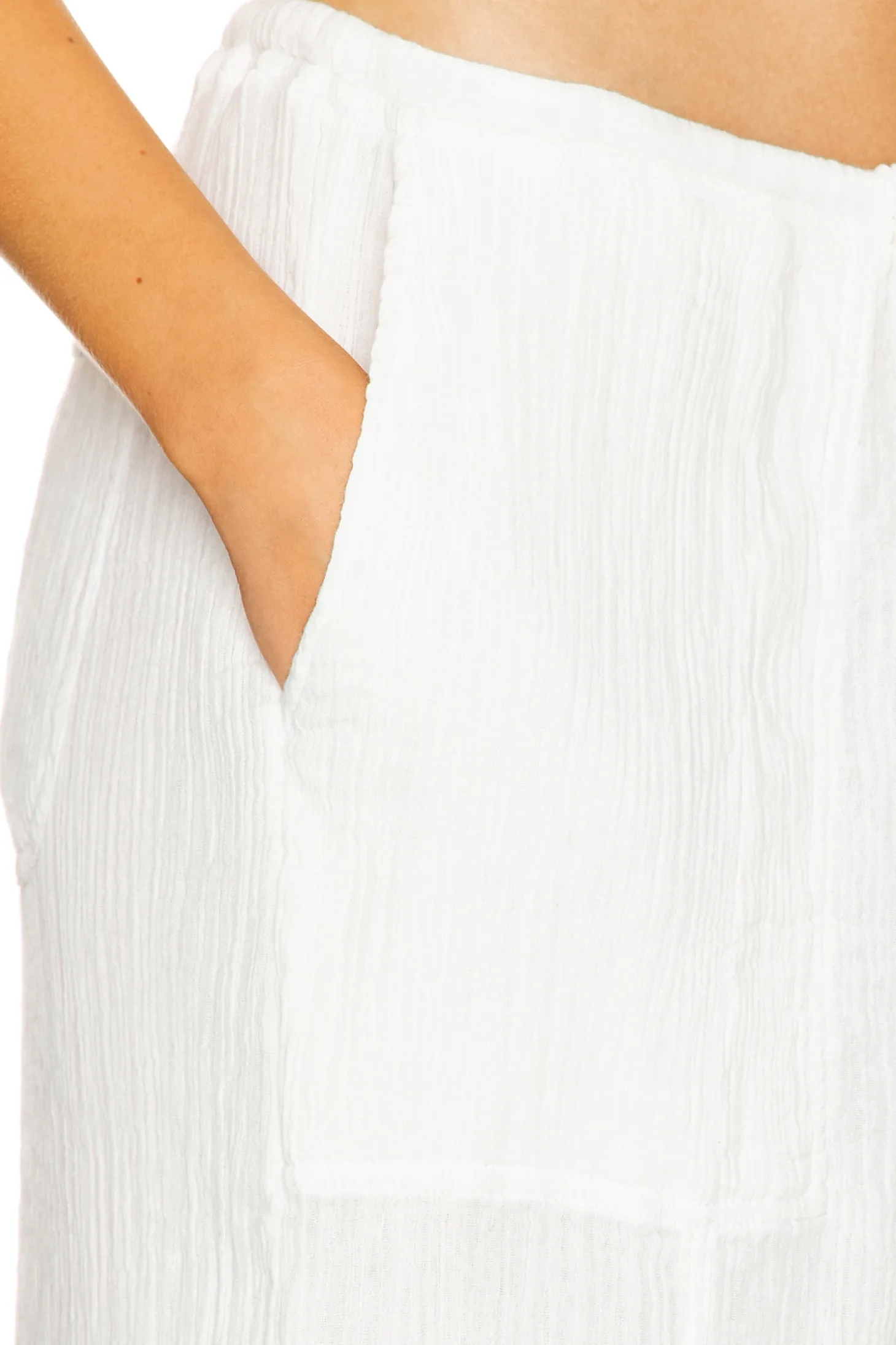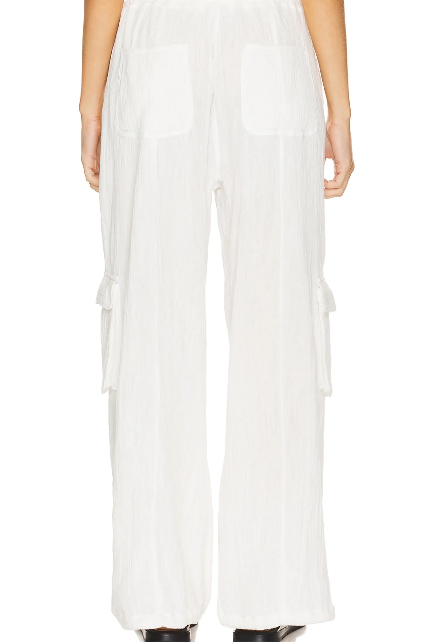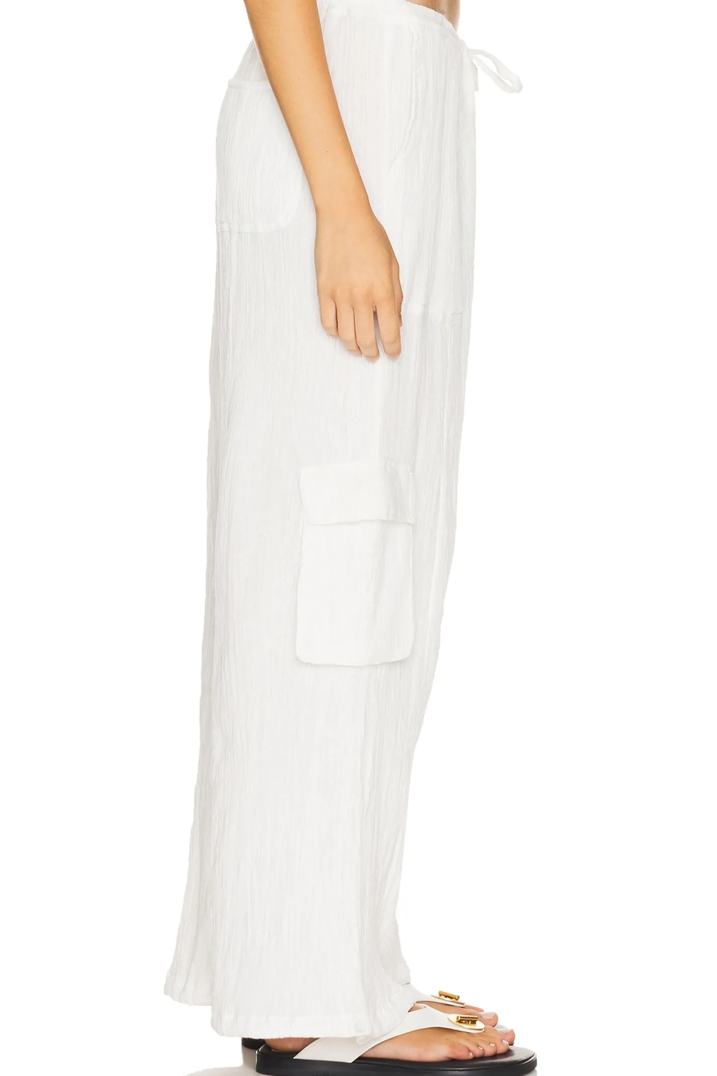 100% cotton.Made in India.Dry clean only.Elastic waistband and drawstring.4-pocket design and side cargo pockets.Slinky linen fabric with drawstring hem.26" at the knee and 26" at the leg opening